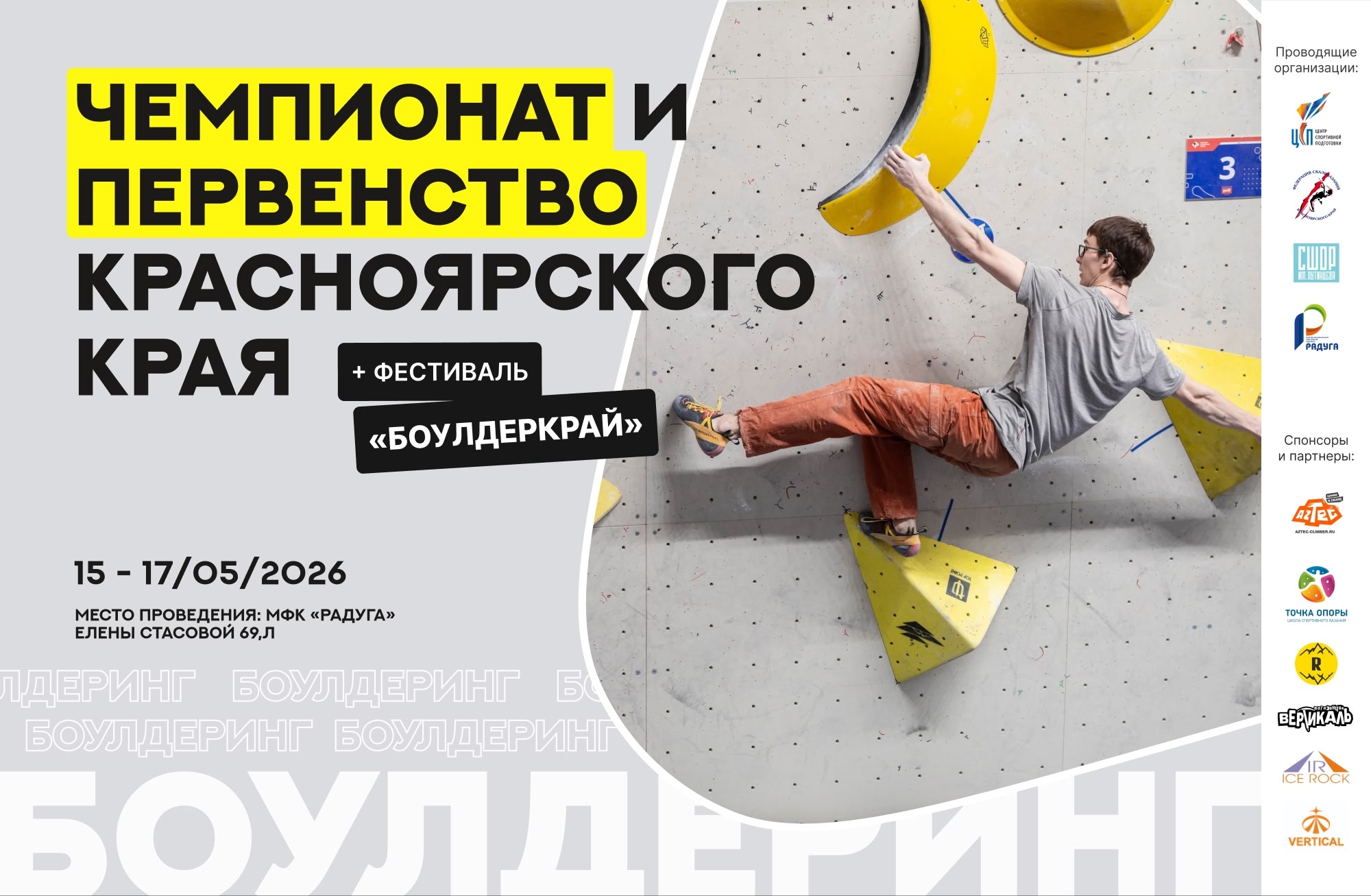 1. Первенство Красноярского края в дисциплине «боулдеринг» юноши, девушки 10-12 лет, юноши, девушки 13-14 лет ПРЕДВАРИТЕЛЬНО на 23-26.10.2026 2. Чемпионат Красноярского края в дисциплинах «лазание на скорость», «лазание на трудность» мужчины, женщины и Первенство красноярского края в дисциплинах «лазание на скорость», «лазание на трудность» юноши, девушки 10-12 лет, юноши, девушки 13-14 лет, юноши, девушки 15-16 лет, юноши, девушки 17-18 лет, юниоры, юниорки 19-20 лет ПРЕДВАРИТЕЛЬНО на 15-19.10.2026 Следите за новостями, возможны изменения! Опубликован календарь спортивных соревнований и фестивалей на 2026 год